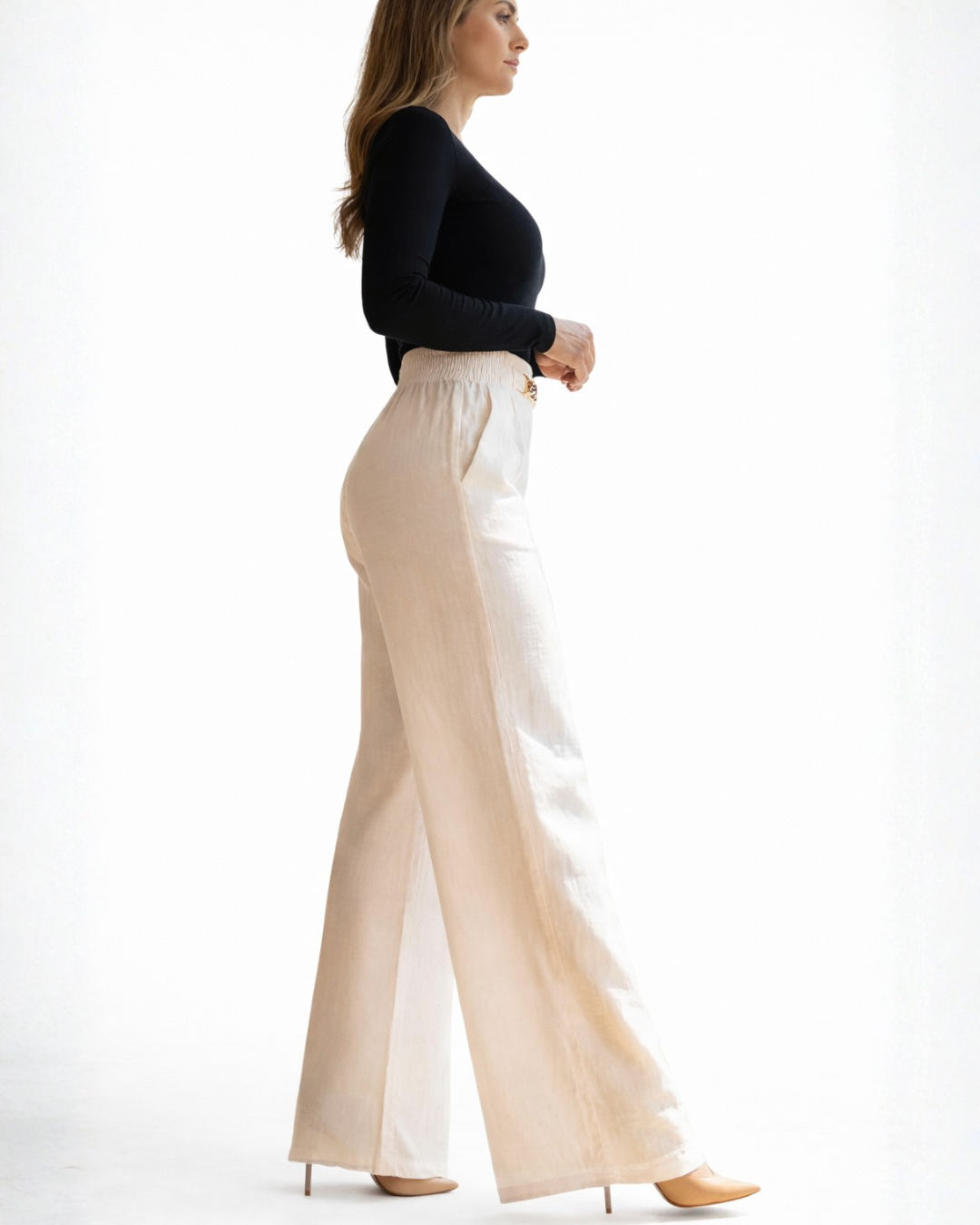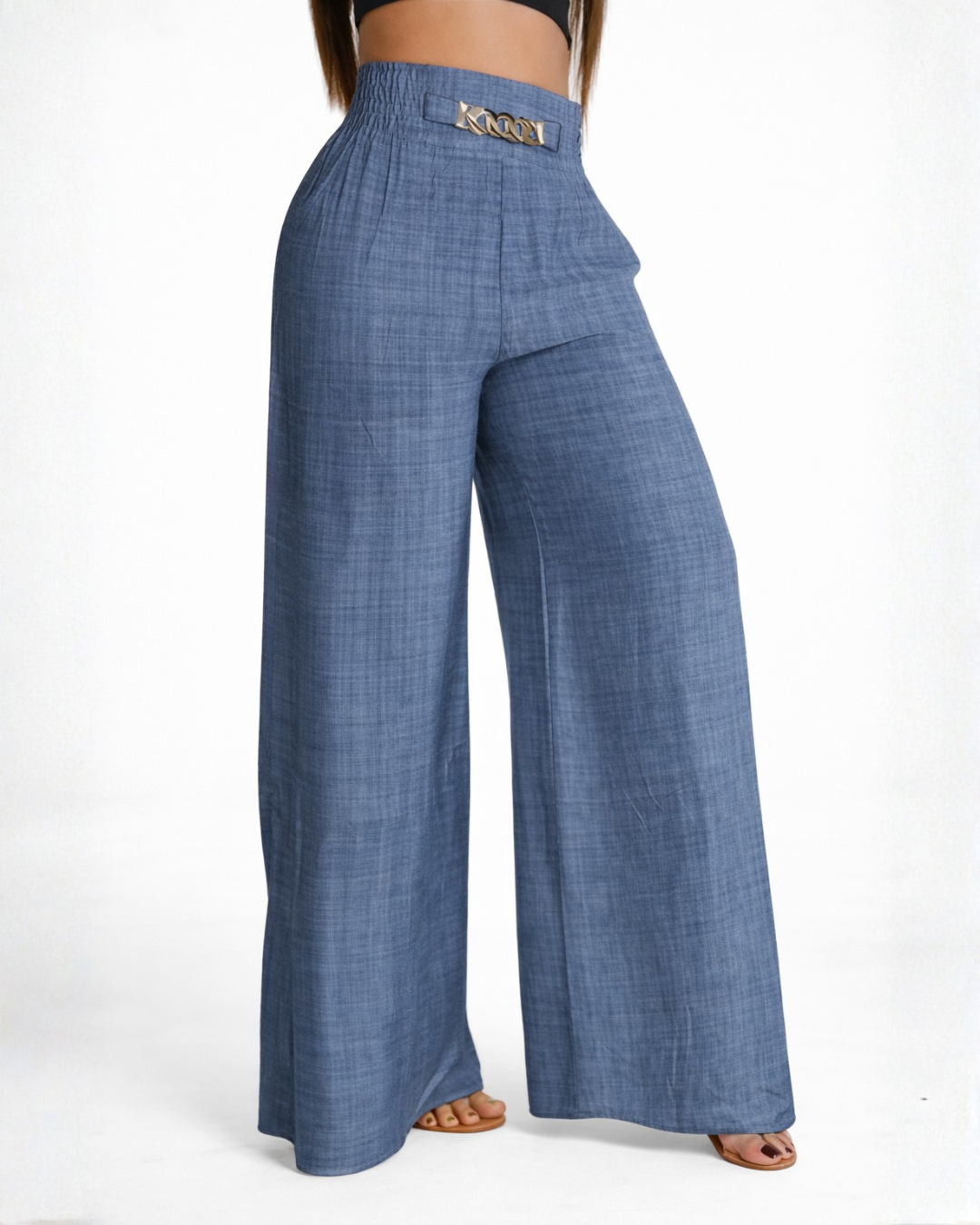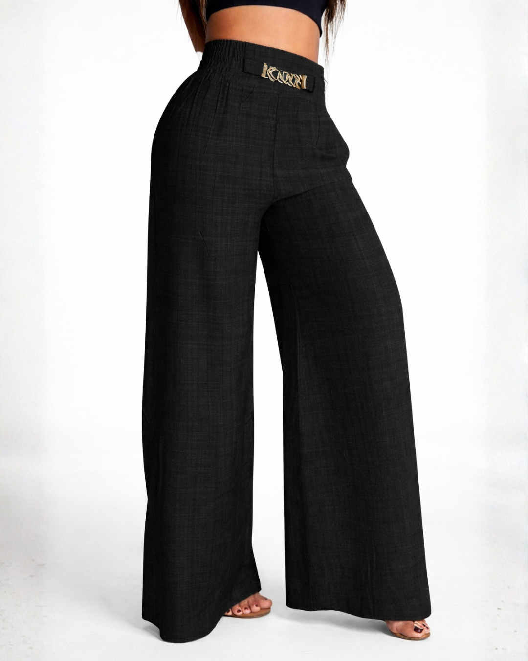 Incorpora um cinto integrado ou decorativo que funciona como um elemento de ajuste funcional e estético. As fivelas e passadores estão dispostos de forma a permitir personalizar o fecho à medida da utilizadora, assegurando que as calças se adaptem perfeitamente à morfologia individual, enquanto adicionam um ponto focal ao design.