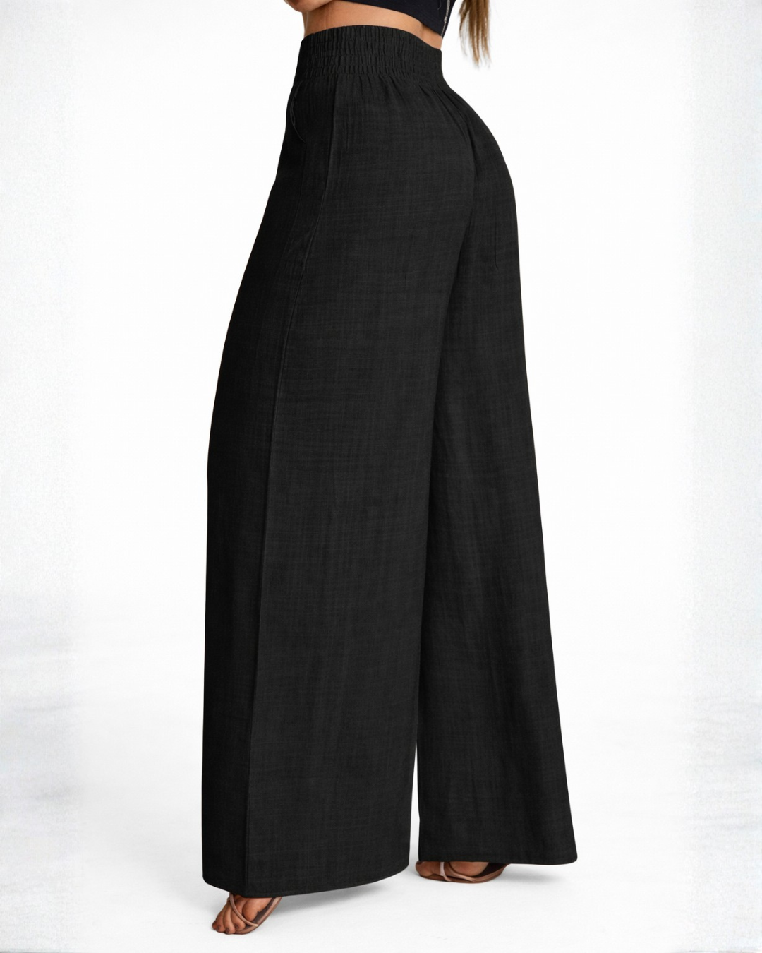 A arquitetura da perna larga (wide leg) foi traçada para oferecer um caimento fluido e elegante desde a anca até à bainha. Este design não só favorece a liberdade de movimentos e a ventilação natural da peça, como também cria uma linha vertical contínua que confere sofisticação e uma estética contemporânea.